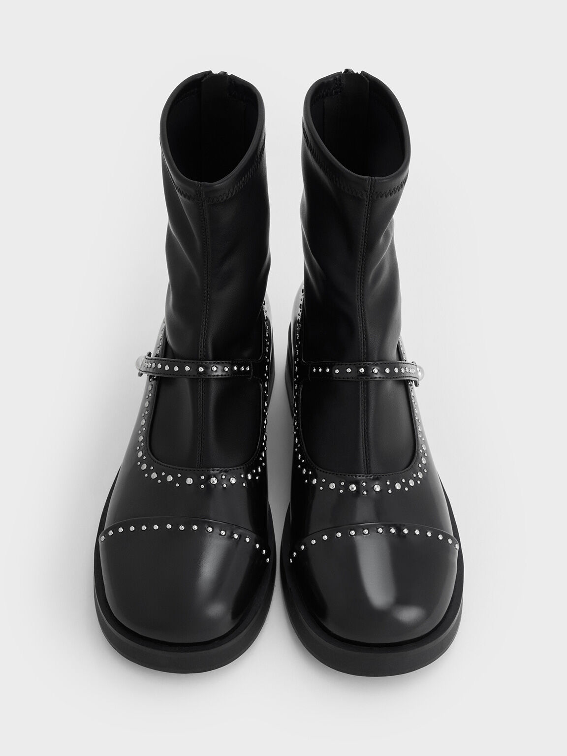 丸みを帯びたつま先と、スタッズが施されたメリージェーンスタイルのストラップが特徴です。