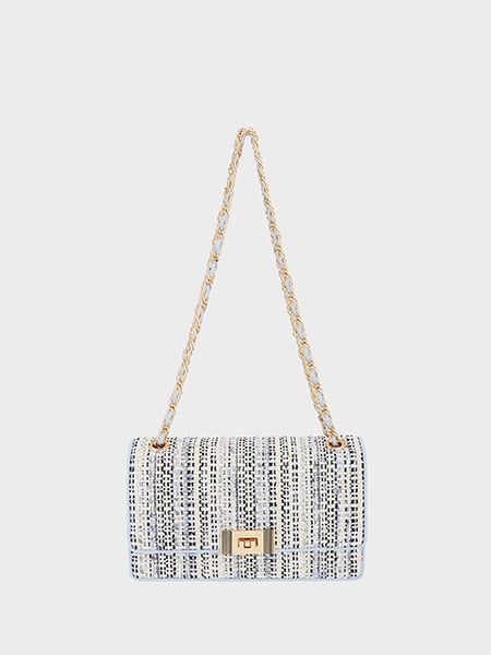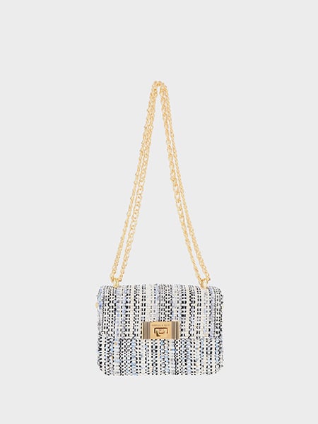 Digital content creator Tine Andrea creates a quietly dramatic look with a long cream coat, which she complements perfectly with the striking Everette chain-strap tweed shoulder bag — the blue textured finish of the bag is set off to great effect against the clean backdrop of the coat.