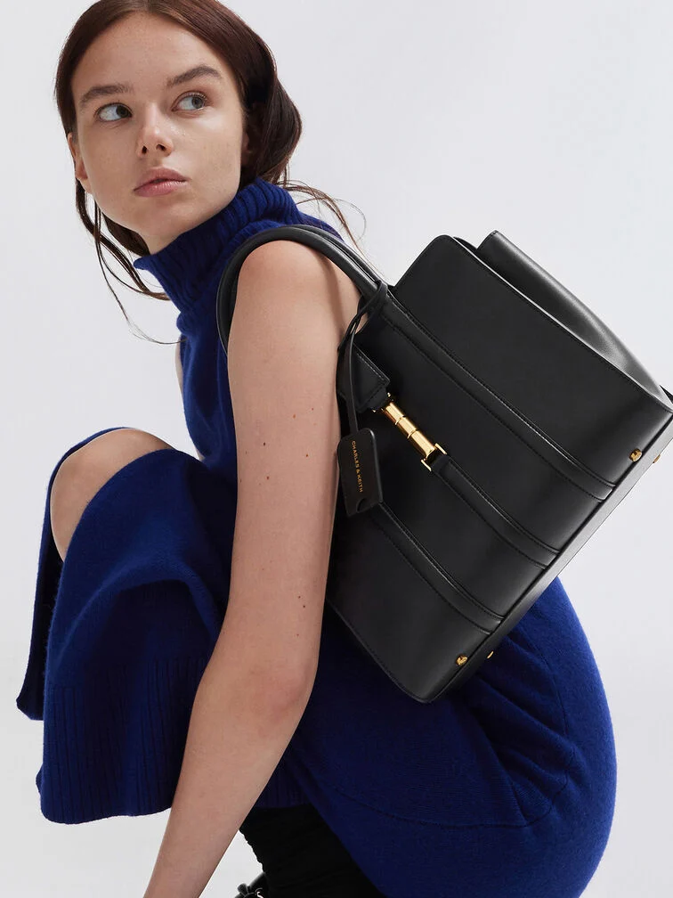 トートバッグは容量が大きいため、ノートパソコンや書類などのかさばるアイテムや必要なものを全部まとめて持ち歩けることが魅力。最近は、キャンバス素材のカジュアルなトートに代わって、レザー風素材の洗練されたデザインが主流に。たとえば、ゴールドのアクセントが効いた黒のレザーライクなトートなら、ビジネスカジュアルなスタイルにもマッチ。見た目も機能性も欲張れるのが、今どきの通勤トートです。